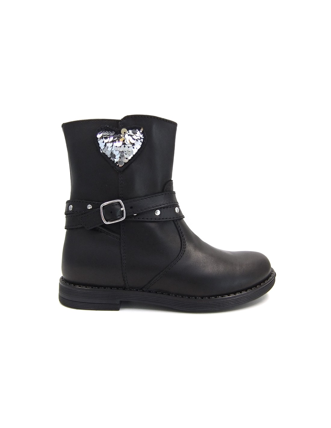 Realizzato in vera pelle è impreziosito da borchie e cuoricini di paillettes: eleganza rock!